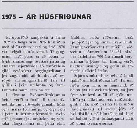Evrópska húsverndarárið 1975 sem haldið var að frumkvæði Evrópuráðsins (Council of Europe) átti mikinn þátt í því að auka skilning á því hve mikil áhrif byggingarlist hefur á lífsgæði og markaði jafnframt þáttaskil í varðveislustarfi víða um Evrópu – meðal annars á Íslandi. Hápunktur ársins var undirritun Amsterdam yfirlýsingarinnar með kjörorðunum „Að gefa fortíðinni framtíð“ (A Future for our Past). Í þeirri yfirlýsingu kom fram að byggingararfurinn sé sameiginlegur arfur allrar Evrópu og ekki einkamál hverrar þjóðar og að staðbundin stjórnvöld beri sérstaka ábyrgð á verndun byggingararfsins, og ætti hann að vera meginmarkmið í skipulagsgerð borga og sveita en ekki bara aukaatriði.