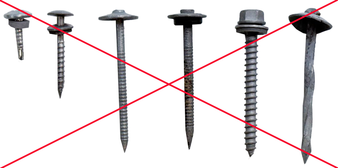 - Einu tilfellin þar sem notkun á skrúfum í bárujárn er samþykkt, er þegar að gatið í timbrinu er orðið of vítt fyrir nagla/hefðbundinn saum.