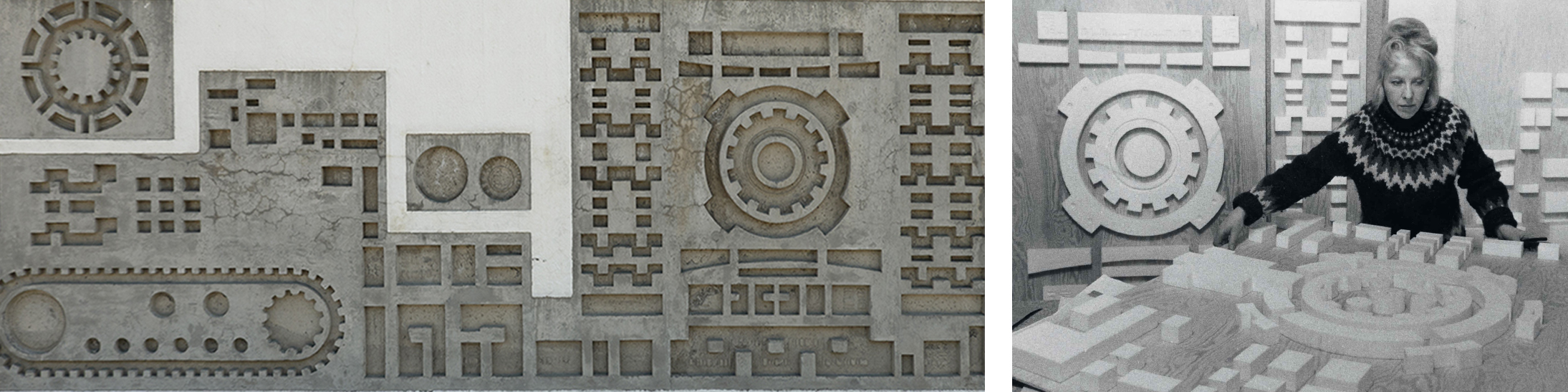 Í húsinu fléttast byggingarlist og myndlist saman á óvenjulegan hátt en á meðan á byggingarferlinu stóð var Gerður Helgadóttir, myndhöggvari og brautryðjandi þrívíðrar abstraktlistar á Íslandi, fengin til að hanna lágmyndir á vesturhlið hússins. Um var að ræða nýjung á Íslandi en ekkert annað hús hafði verið prýtt með lágmyndum að utanverðu á þeim tíma.